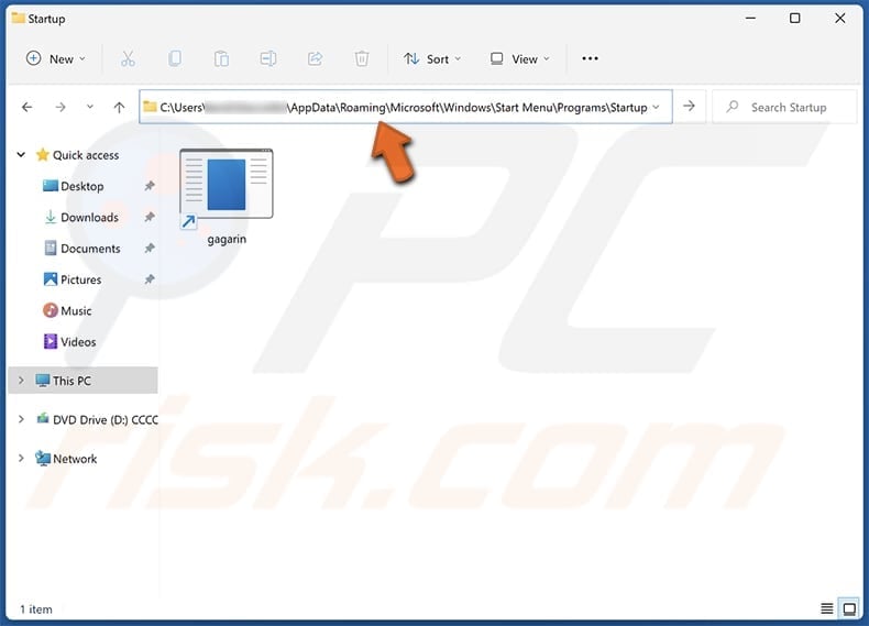 4. Find "gagarin" in "C:\Users\[user_name]\AppData\Roaming\Microsoft\Windows\Start Menu\Programs\Startup" folder (if not present, enable the display of hidden files) and delete it:
