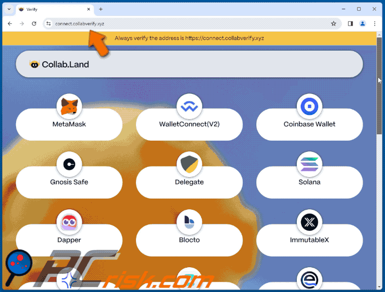 The scheme also included a banner stressing the need for visitors to verify the platform's domain but listed the URL of the fraudulent page – connect.collabverify[.]xyz. Due to the prevalence of imitator sites such warnings are not uncommon, and this inclusion creates an impression of legitimacy for the scam webpage. Keep in mind that this scam could be hosted on other domains as well.