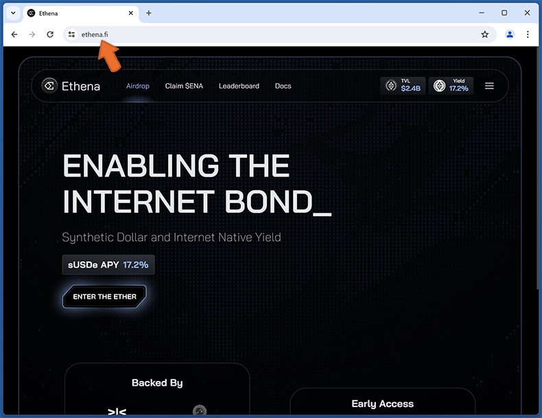 "Claim Ethena" is a scam presented as the official Ethena website. Users are lured into "connecting" their digital wallets by a promise of being able to claim the ENA (Ethena) cryptocurrency. Instead, the scheme triggers a crypto drainer that can steal funds out of exposed wallets.