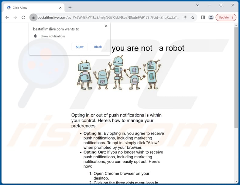 Bestafilmslive[.]com instructs its visitors to click the "Allow" button to prove that they are not robots. The site implies that clicking that button is required to pass a CAPTCHA and access its content. However, doing so permits bestafilmslive[.]com to send notifications. Bestafilmslive[.]com also provides instructions on allowing or blocking notifications.