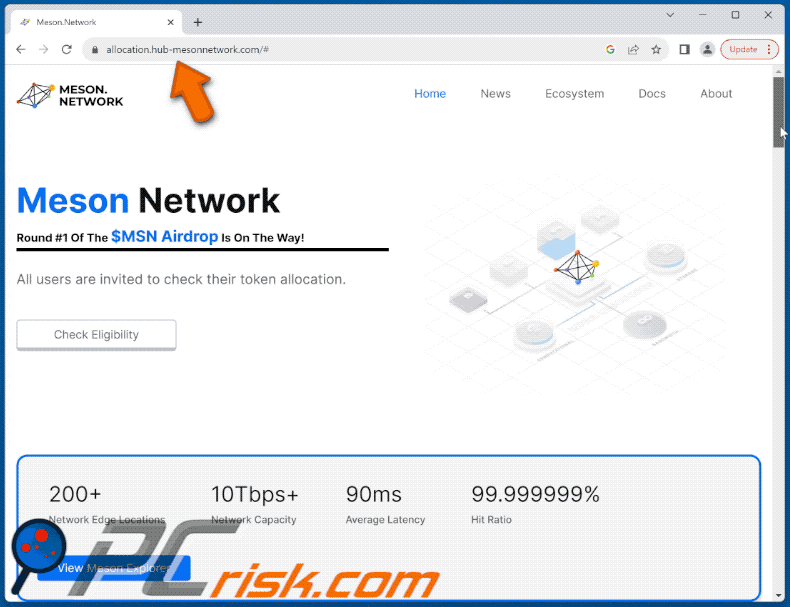 We have examined both websites (claim-mesonnetwork[.]app and allocation.hub-mesonnetwork[.]com) promoting a Meson ($MSN) airdrop and discovered that they promote a fake giveaway. The scammers behind this campaign aim to trick visitors into believing that they are on the legitimate Meson platform (meson[.]network). Their goal is to steal cryptocurrency.