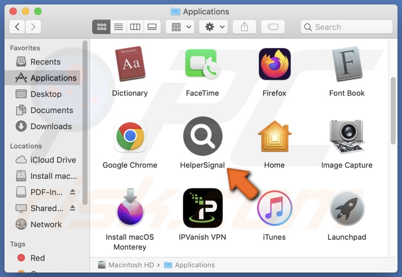 Remove HelperSignal-related potentially unwanted applications from your "Applications" folder: