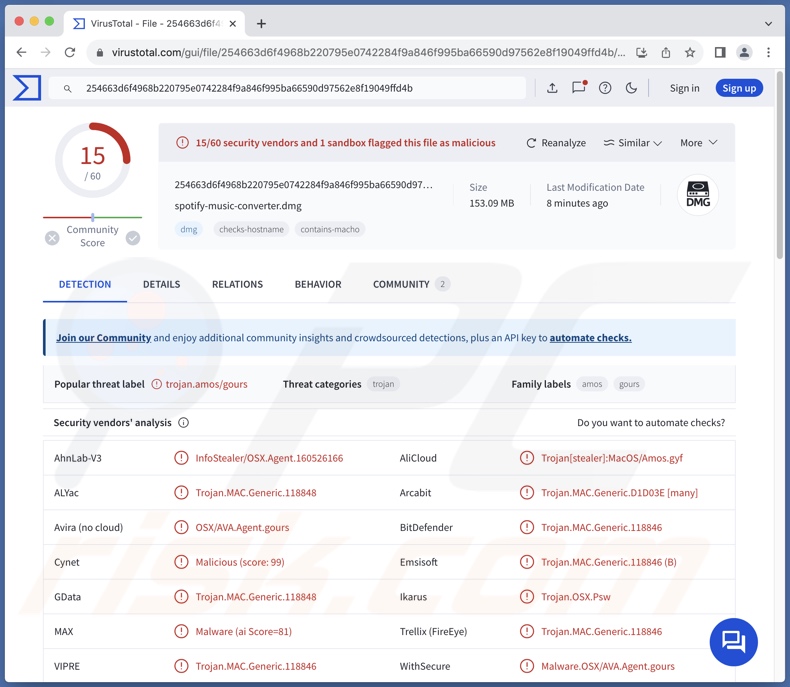| Detection Names | Combo Cleaner (Trojan.MAC.Generic.118846), Emsisoft (Trojan.MAC.Generic.118846 (B)), Ikarus (Trojan.OSX.Psw), Kaspersky (HEUR:Trojan-PSW.OSX.Amos.gen), WithSecure (Malware.OSX/AVA.Agent.gours), Full List Of Detections (VirusTotal) |
