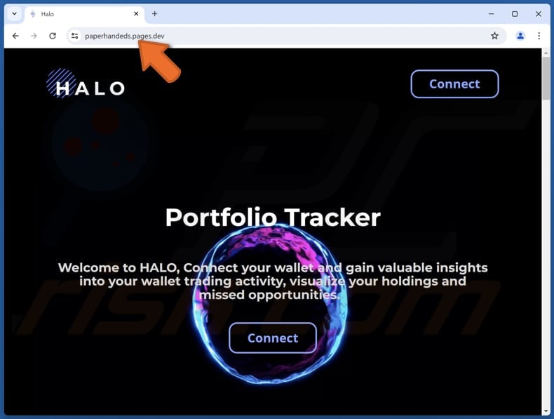 The scam page appears to be masquerading as a portfolio tracker named "HALO". It invites users to connect their wallets to gain valuable insights into their trading activity. This scam page suggests that users can visualize their holdings and identify missed opportunities. However, it is a deceptive attempt to steal cryptocurrency.