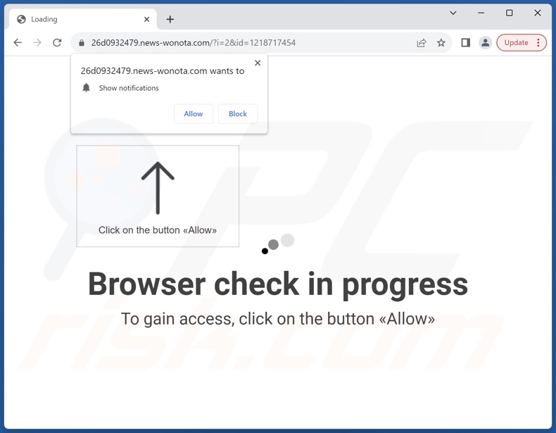 Our researchers found news-wonota[.]com while inspecting dubious sites. After examining this rogue page, we learned that it promotes browser notification spam and redirects visitors to other (likely suspicious/dangerous) websites.
