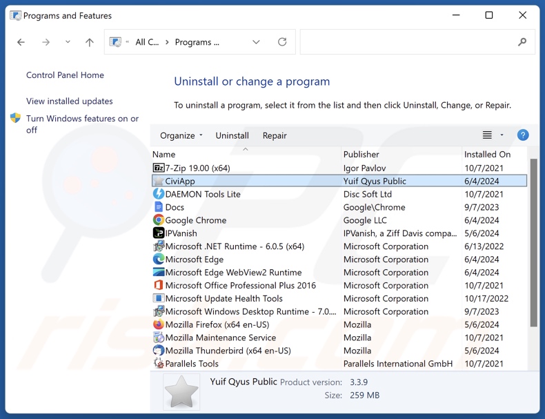 In the uninstall programs window, look for "CiviApp" and other suspicious/recently-installed applications, select these entries and click "Uninstall" or "Remove".