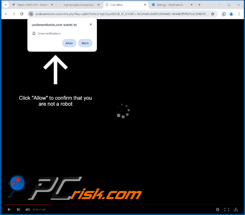 Undenentionin[.]com displays a fake video player with a loading spinner and a message instructing you to click the "Allow" button to confirm that you are not a robot. The site implies that clicking the "Allow" button is required to pass a CAPTCHA and load the content (supposedly a video). However, clicking that button while visiting undenentionin[.]com grants the site permission to show notifications.