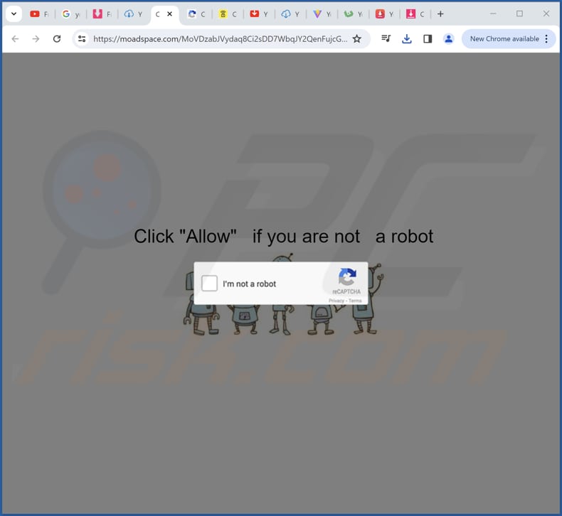 Upon visiting moadspace[.]com, users are presented with an image of robots and instructions to click "Allow" if they are not robots. Moadspace[.]com suggests that clicking "Allow" is required to complete a CAPTCHA. However, doing so actually grants the page permission to deliver notifications.