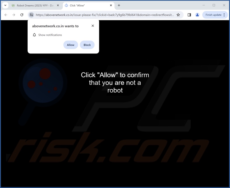 The dark blank webpage included instructions to – "Click 'Allow' to confirm that you are not a robot". Completing them enables abovenetwork.co[.]in to deliver browser notification spam. Basically, the website is granted permission to display notifications (ads) that commonly promote online scams, unreliable/hazardous software, and even malware.