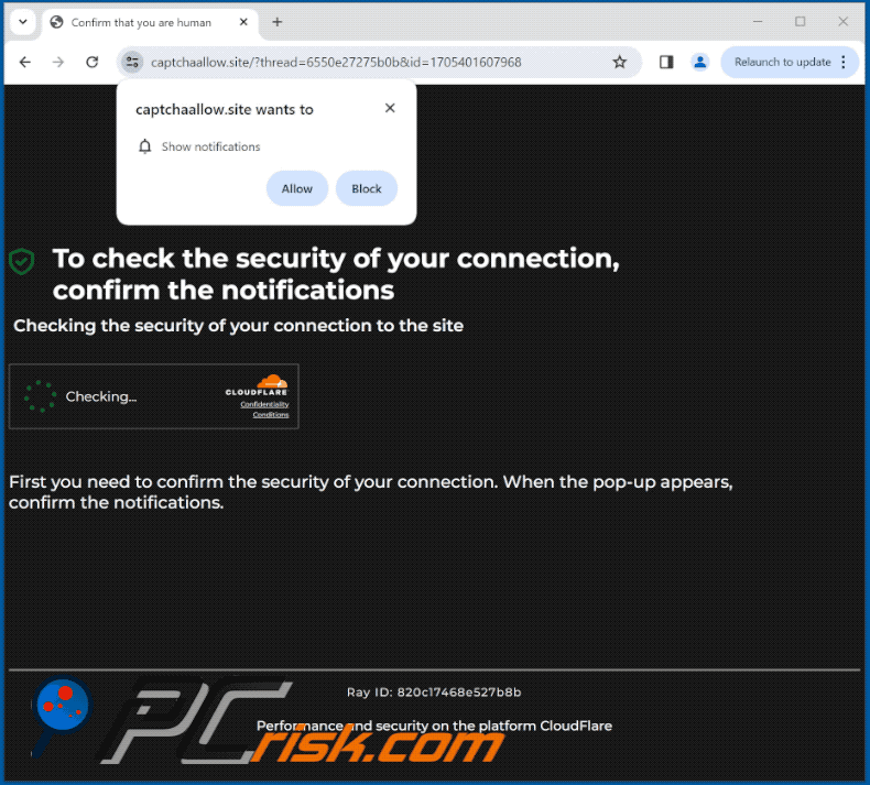 We have inspected captchaallow[.]site and found that its purpose is to trick visitors into granting it permission to show notifications. Usually, notifications from sites like captchaallow[.]site are deceptive and can expose users to malicious content. Therefore, users should avoid allowing captchaallow[.]site to send notifications.