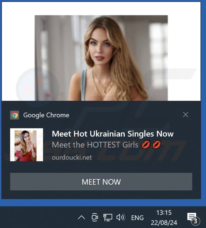 The true purpose of ourdoucki[.]net is to trick visitors into allowing it to send notifications. These notifications often contain fake offers to meet "hottest girls". Clicking them can take users to untrustworthy adult sites, phishing websites, technical support scams, fake giveaways, lotteries, pages hosting malware (or unwanted software), etc.