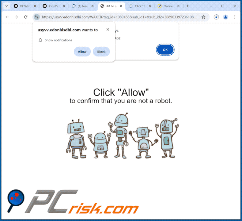 On edonhisdhi[.]com, an image of robots with a message instructing to click "Allow" to confirm tat you are not a robot is presented. The intention behind this approach is to trick visitors into believing they must click "Allow" to pass a CAPTCHA and access the page. The instructions on edonhisdhi[.]com are deceptive and following them leads to permitting the site to show notifications.