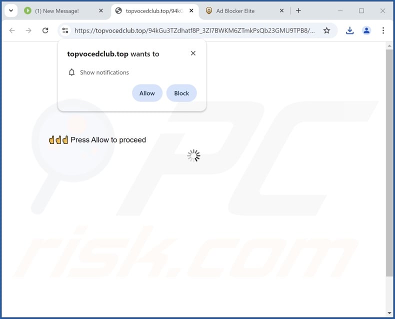 Topvocedclub[.]top is a rogue page that we discovered during a routine inspection of suspicious websites. The webpage endorses spam browser notifications and redirects users to other (likely unreliable/harmful) sites.