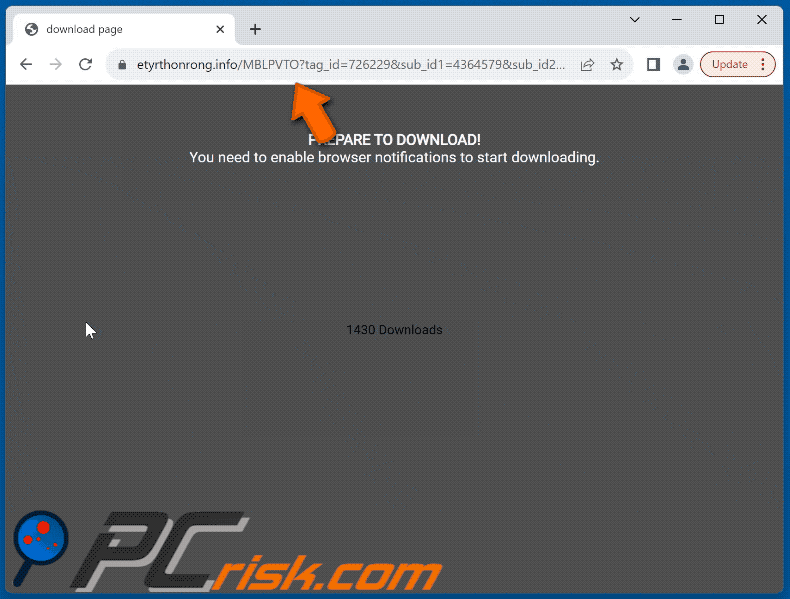 On etyrthonrong[.]info, visitors are presented with "PREPARE TO DOWNLOAD!" and "You need to enable browser notifications to start downloading." messages and a fake number of downloads. Etyrthonrong[.]info implies that visitors will be able to download some media or software upon agreeing to receive notifications from the page.
