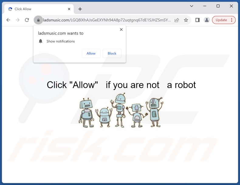 When we examined the ladsmusic[.]com page, it presented us with an image depicting five cartoon-style robots above which were instructions to – "Click 'Allow' if you are not a robot". If a visitor completes this hoax CAPTCHA verification test – they inadvertently permit ladsmusic[.]com to deliver browser notifications.