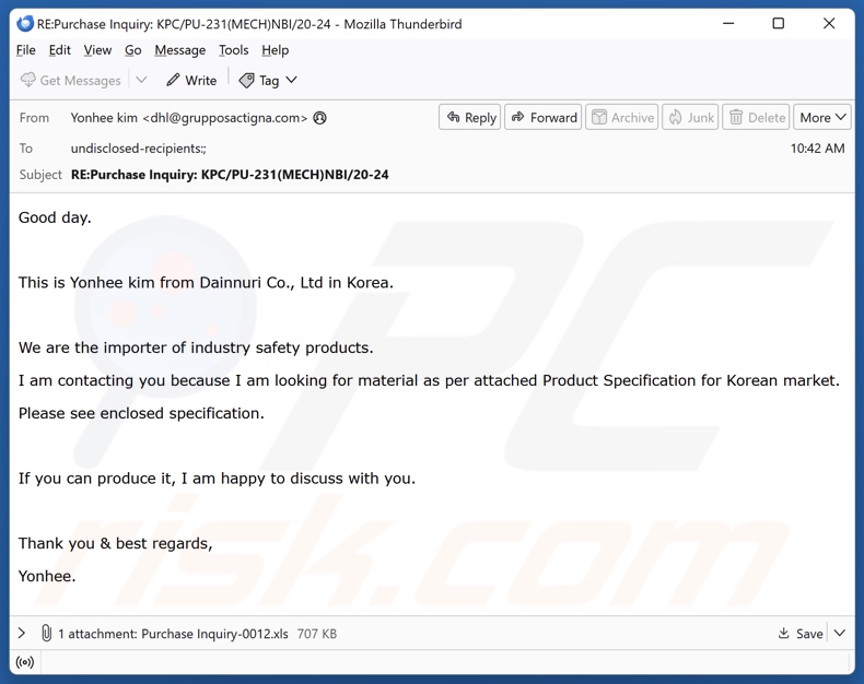 The file attached to this letter – "Purchase Inquiry-0012.xls" (filename may vary) – is intended to infect devices with malware. This malicious Microsoft Excel file is disguised as a product specification document overlaid with instructions to enable editing (macro commands) to access the protected information. Once the document's macros are enabled, it executes the malware download/installation chain.