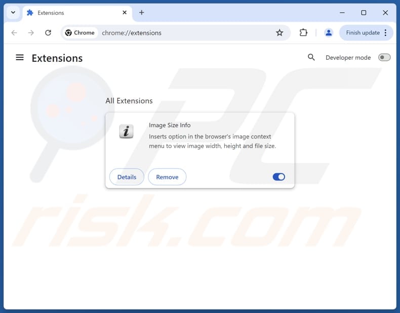 (at the top right corner of Google Chrome), select "Extensions" and click "Manage Extensions". Locate all recently-installed suspicious extensions (e.g., Image Size Info) , select these entries and click "Remove".