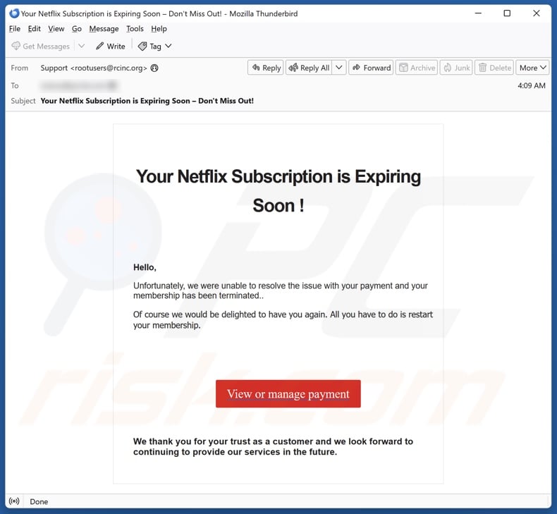 Phishing/ScamAlso Known As: "Your Netflix Subscription Is Expiring Soon" phishing email