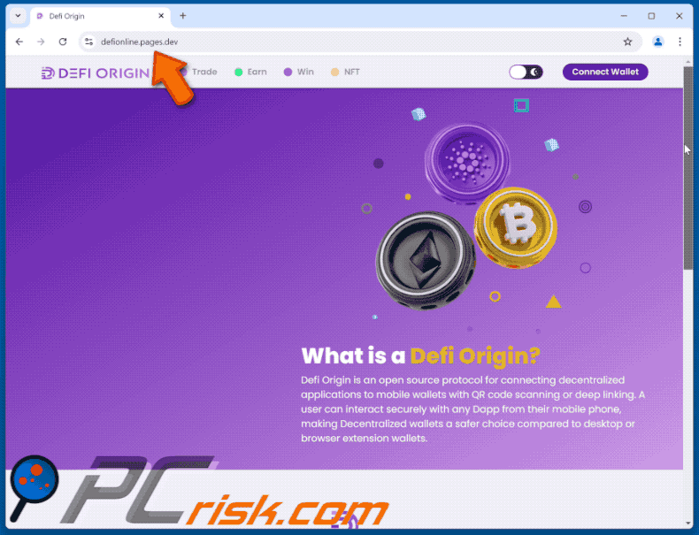 This "Defi Origin" platform (defionline.pages[.]dev; may be hosted elsewhere) is fake. The scam operates as a cryptocurrency drainer. Essentially, digital assets are stolen from exposed cryptowallets. Regardless of potential similarities to existing platforms, this scheme is not associated with any of them.