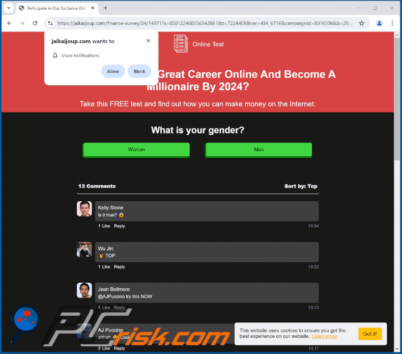 Jaikaijoup[.]com hosts a fake survey that offers visitors the opportunity to find out whether they would make a great career online and become millionaires by 2024. The site prompts users to answer several questions and includes fake comments to create an illusion of credibility. Also, jaikaijoup[.]com asks for permission to show notifications.