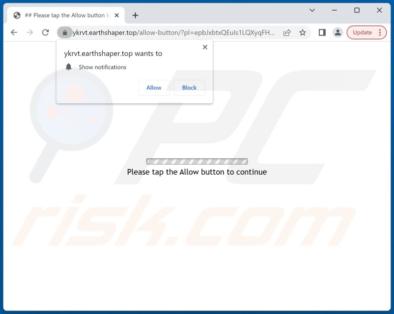 Earthshaper[.]top presents a loading bar with a message instructing visitors to "tap the Allow button to continue". The "Allow" button is an option provided by a web browser. Earthshaper[.]top suggests that clicking this button will load its content. In reality, this action will grant the site permission to show notifications.