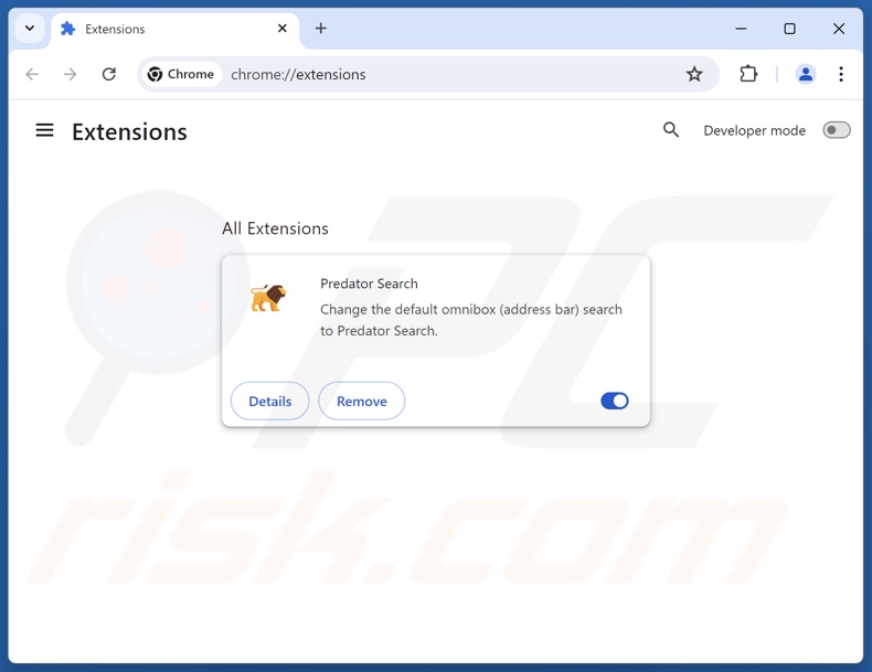 (at the top right corner of Google Chrome), select "Extensions" and click "Manage Extensions". Locate "Predator Search" and other recently-installed suspicious extensions, select these entries and click "Remove".