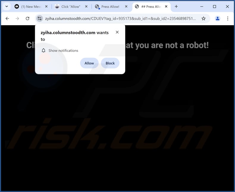 Columnstoodth[.]com displays two deceptive messages saying to click "Allow", supposedly to close the page and prove that you are not a robot (to pass a CAPTCHA). However, clicking "Allow" (or a similar option provided by a browser) permits columnstoodth[.]com to send notifications. Our analysis has shown that notifications from columnstoodth[.]com are misleading.