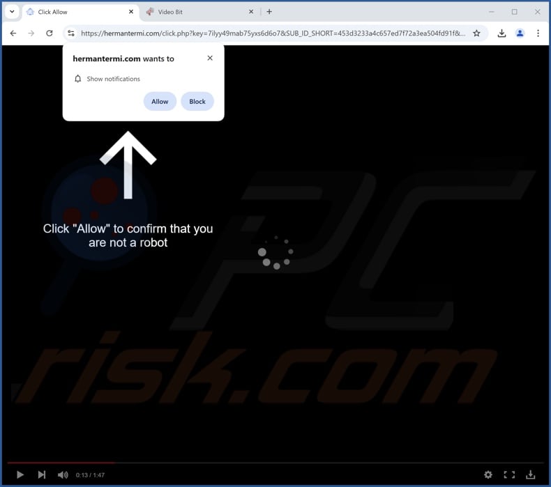 When we inspected hermantermi[.]com, it displayed a continuously buffering video player. Atop the fake player were instructions to – "Click 'Allow' to confirm that you are not a robot". This CAPTCHA verification is bogus, and by completing it – users inadvertently enable hermantermi[.]com to deliver browser notifications.