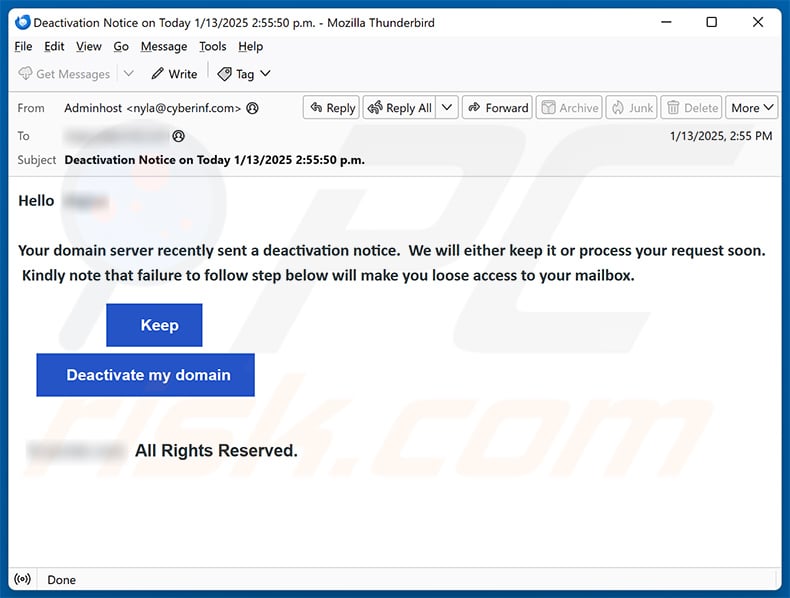 Phishing/ScamAlso Known As: "Domain Service Sent A De-activation Notice" phishing email
