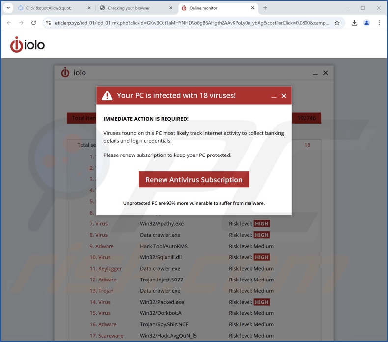 "iolo - Your PC is infected with 18 viruses!" scam overview
