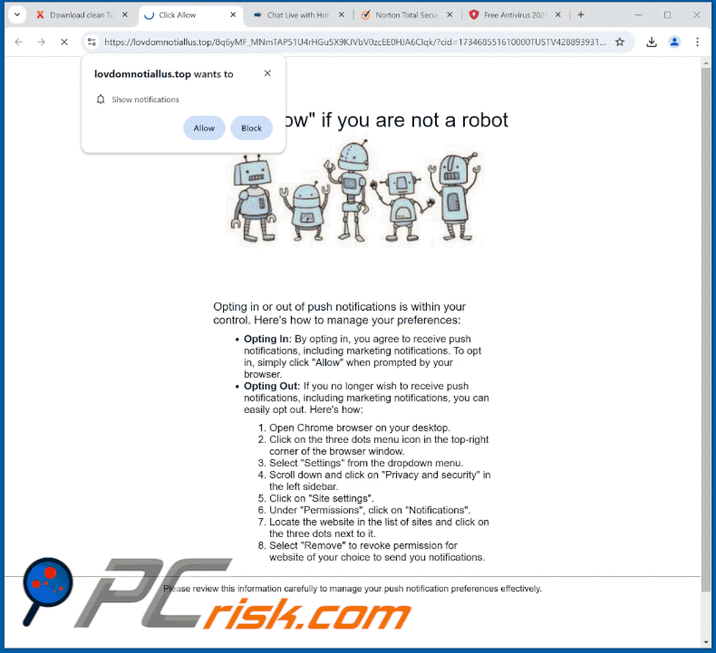 On lovdomnotiallus[.]top, an image of robots with a message instructing visitors to click "Allow" if they are not robots is presented. Also, the site provides information on opting in and out of notifications. However, the previous message suggests that visitors have to click "Allow" to pass a CAPTCHA.
