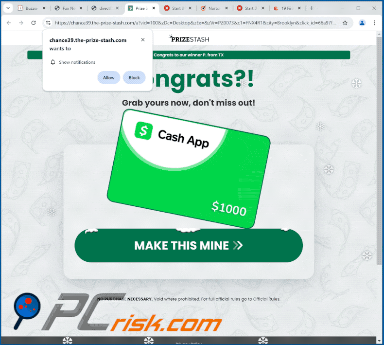 The-prize-stash[.]com claims to offer visitors a chance to "grab" a $1000 Cash App gift card. However, following the instructions on the site can lead to data theft, as the site requests various details to "receive" the gift card. Thus, it is highly advisable not to enter any personal information on the-prize-stash[.]com.