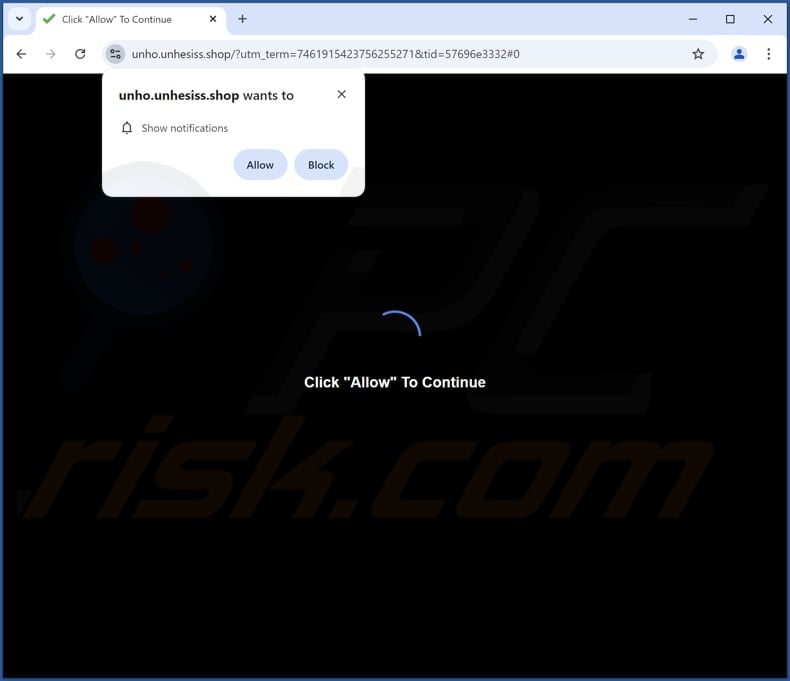 Unhesiss[.]shop presents a loading spinner and a message instructing visitors to click "Allow" to continue. The website suggests that clicking "Allow" is required to access it. However, in reality, doing so permits unhesiss[.]shop to show notifications. These notifications can contain fake messages, warnings, offers, etc.