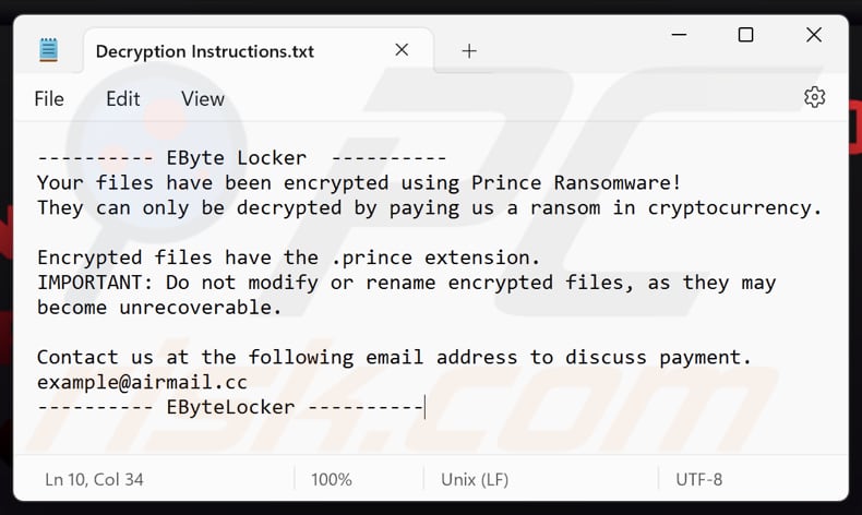 We discovered EByte Locker while analyzing malware samples submitted to VirusTotal. During the inspection, we found that EByte Locker is ransomware based on Prince. Upon infiltration, EByte Locker encrypts files and appends ".EByteLocker" to them. It also changes the desktop wallpaper and provides a ransom note ("Decryption Instructions.txt").