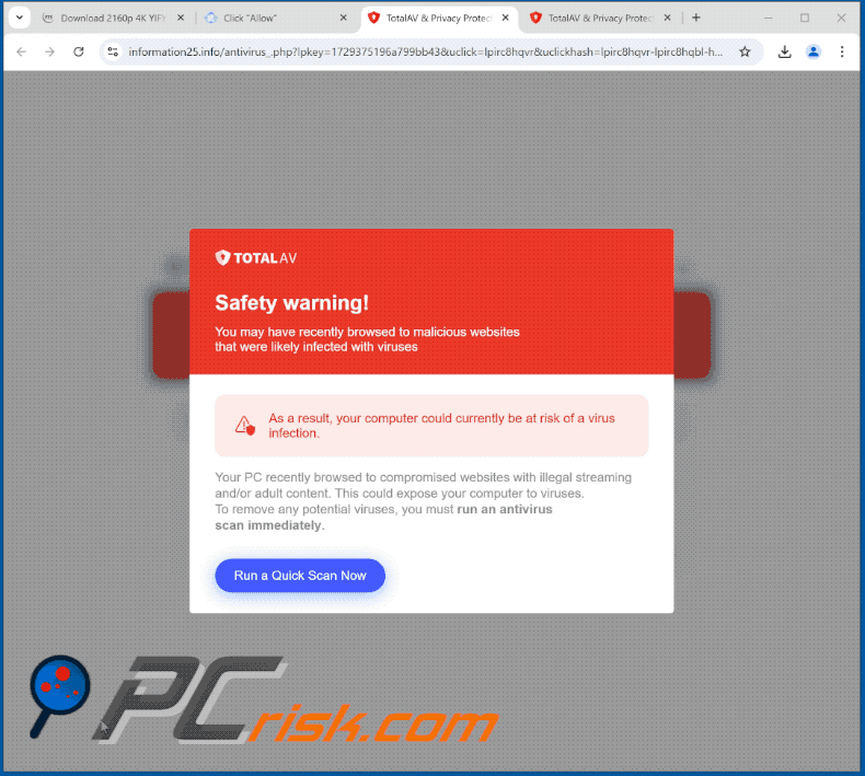 Appearance of the TotalAV version of the "Safety Warning" pop-up scam (GIF):