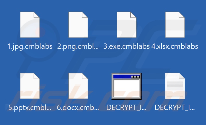 On our testing system, CmbLabs ransomware encrypted files and appended their names with a ".cmblabs" extension. To elaborate, a file initially titled "1.jpg" appeared as "1.jpg.cmblabs", "2.png" as "2.png.cmblabs", etc.