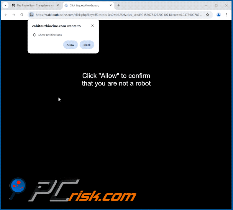 Our team has analyzed cabitauthiocine[.]com and found that this is a misleading web page created to trick visitors into accepting its notifications. If this permission is granted to cabitauthiocine[.]com, the site can send fake warnings and other deceptive notifications. Therefore, cabitauthiocine[.]com and similar sites should be avoided.