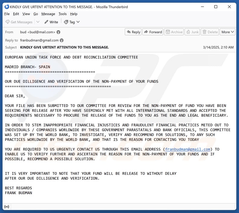 The email also states that the committee, set up by the World Bank, is investigating fraudulent practices by government officials and banks worldwide. The recipient is urged to contact the sender via email (franbudman@gmail.com) for further verification. The email promises that their funds will be released after verification.