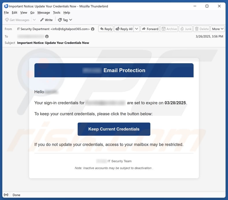 Phishing/ScamAlso Known As: Email Credentials Protection phishing email