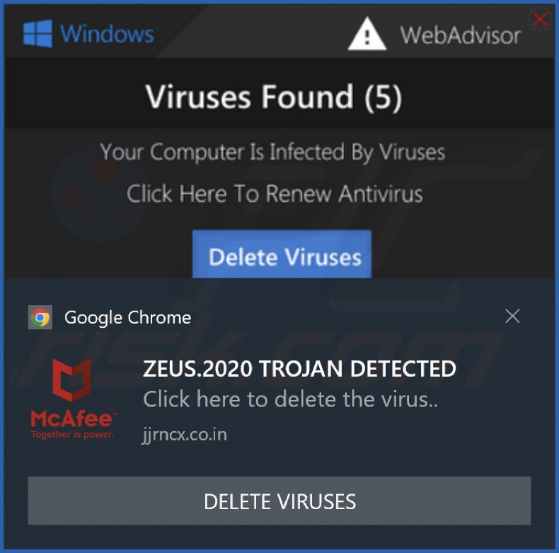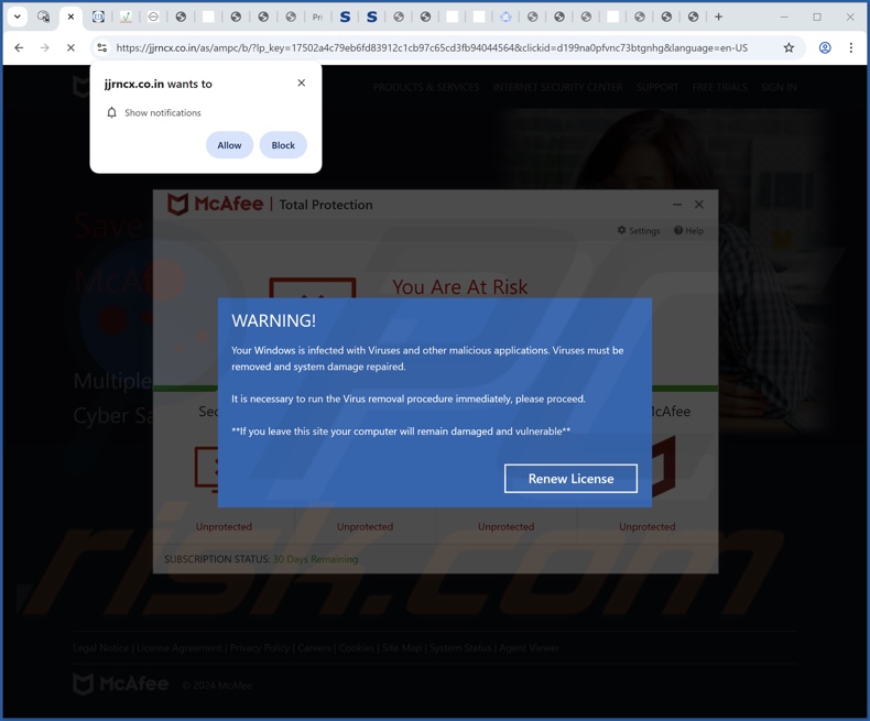 It is noteworthy that the behavior of rogue webpages (i.e., what they host/promote) might differ depending on the visitor's IP address/ geolocation. At the time of research, jjrncx.co[.]in ran a scam similar to "McAfee - Computer Is At Risk Of Virus Infection", "McAfee - Your Computer Is Severely Damaged", "McAfee - Subscription Payment Failed", "McAfee Safety Warning", and many others.