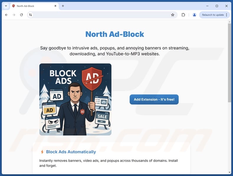 North Ad-Block has an "official" promotional webpage. These types of pages and scam sites distributing adware are primarily accessed via redirects produced by websites utilizing rogue advertising networks, intrusive ads, mistyped URLs, and spam browser notifications.