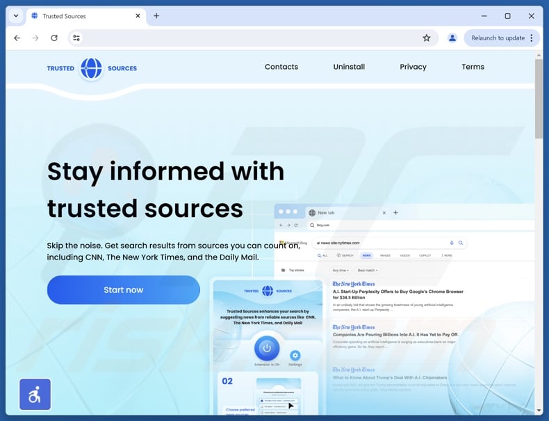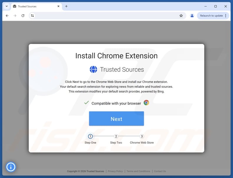 Trusted Sources has an "official" promotional webpage. In addition to such deceptive pages, browser hijackers are often endorsed on scam sites. Most visitors access these webpages via redirects produced by intrusive ads, websites employing rogue advertising networks, spam browser notifications, mistyped URLs, and adware.