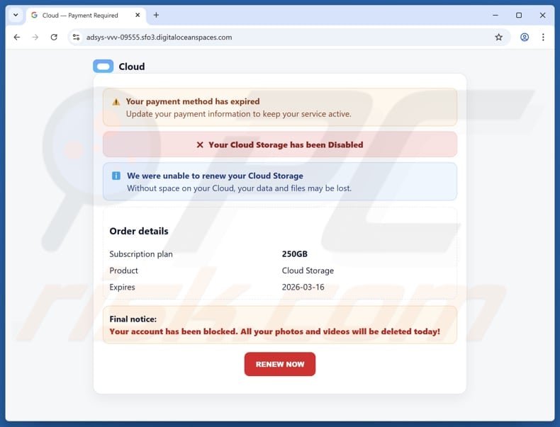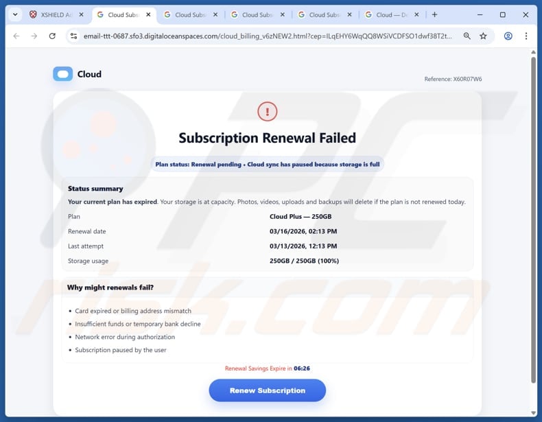 Overall, this scam involves fake storage or subscription alerts and urges users to act quickly. The real goal is to profit from affiliate commissions. Even when real products are promoted, the methods are deceptive and not used by legitimate companies. Recipients of fraudulent emails should ignore those messages and not open the provided websites.