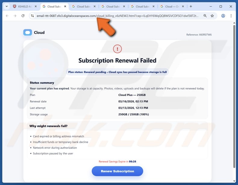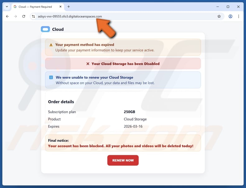 The message is presented as an automated notice from cloud services and includes an option to "Reactivate Storage Now". This link leads to fraudulent websites. These pages make similar claims to the email - they suggest that there is an issue with the storage or subscription and that immediate action is needed to avoid losing data.