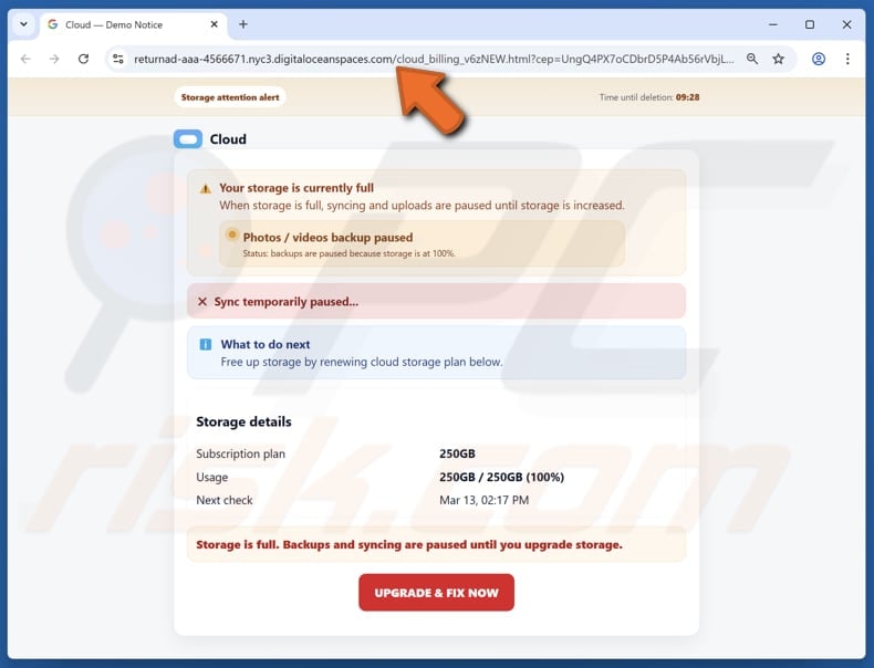 Our team has analyzed this message and determined that it is a scam disguised as a notification from a cloud service regarding account storage. It urges recipients to click a link included in the message. Following the instructions in the email can direct users to deceptive websites. It is recommended to ignore and delete this email if received.