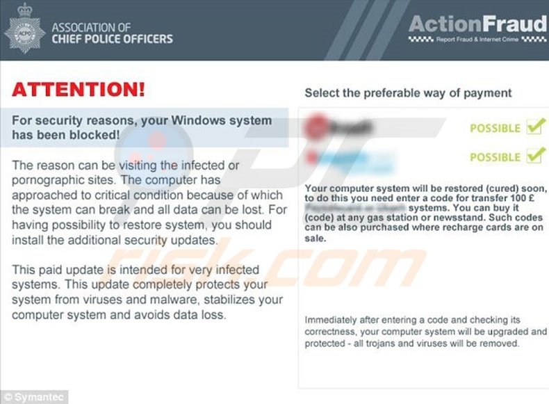 Cyber criminals responsible for the Association of Chief Police Officers ransomware use Ukash and Paysafecard (pre-paid cards) in order to transfer the money for the fake security update. This method of money transfer is very difficult to track. Do not trust any information displayed by this screen locker - it is a scam.