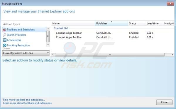 (at the top right corner of Internet Explorer) select "Manage Add-ons". Look for the following entries: "Conduit Apps Toolbar" (or any other entries related to conduit) and disable them.