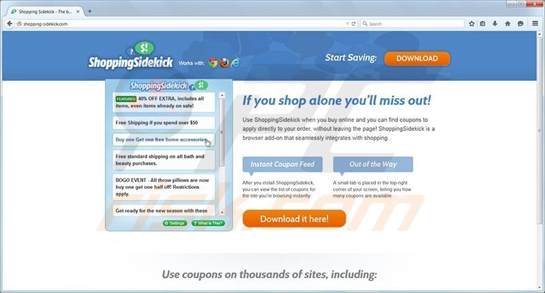 Shopping Sidekick is an unwanted browser extension developed by 215 Apps. This browser add-on promises to display relevant coupon ads when users visit online shopping websites such as Expedia, Target, Walmart, GameStop, etc. Unfortunately, the developers use a deceptive marketing method for distribution of this software called 'bundling'.