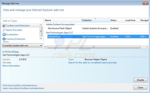 (at the top right corner of Internet Explorer) select "Manage Add-ons". Look for GenTechnologies Apps LLC related entries ("UnfriendApp") and disable them.