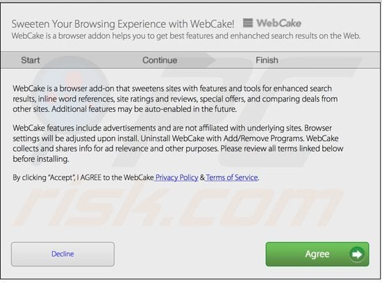 Uncheck any ticks suggesting you install additional browser add-ons, toolbars, etc. and do not allow modifications to your Internet browser settings such as the default search engine, homepage, etc. WebCake is just one of many unwanted browser add-ons using deceptive promotion methods to install on users' systems.